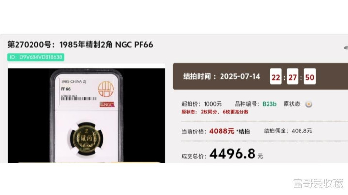 例如:在2025年7月14日的“春秋大拍”中,就有一枚1985年的“精制2角”,NGC评级分数为66分,最后拍出了4496.8元!