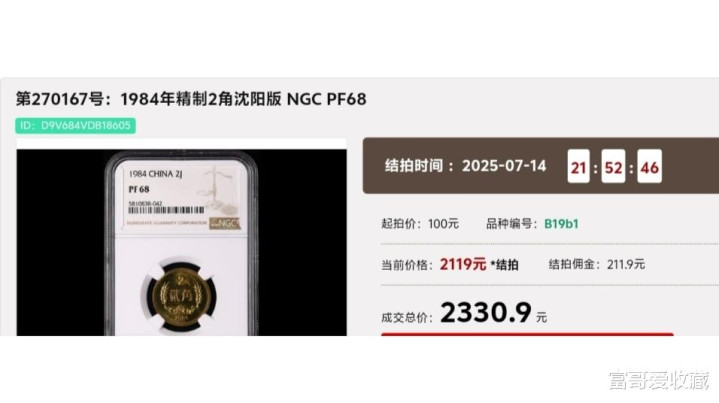 在2025年7月份的“春秋大拍”中,一枚NGC评级分数68分,1984年的(沈阳版)“精制2角”,最后拍出了2330.9元!